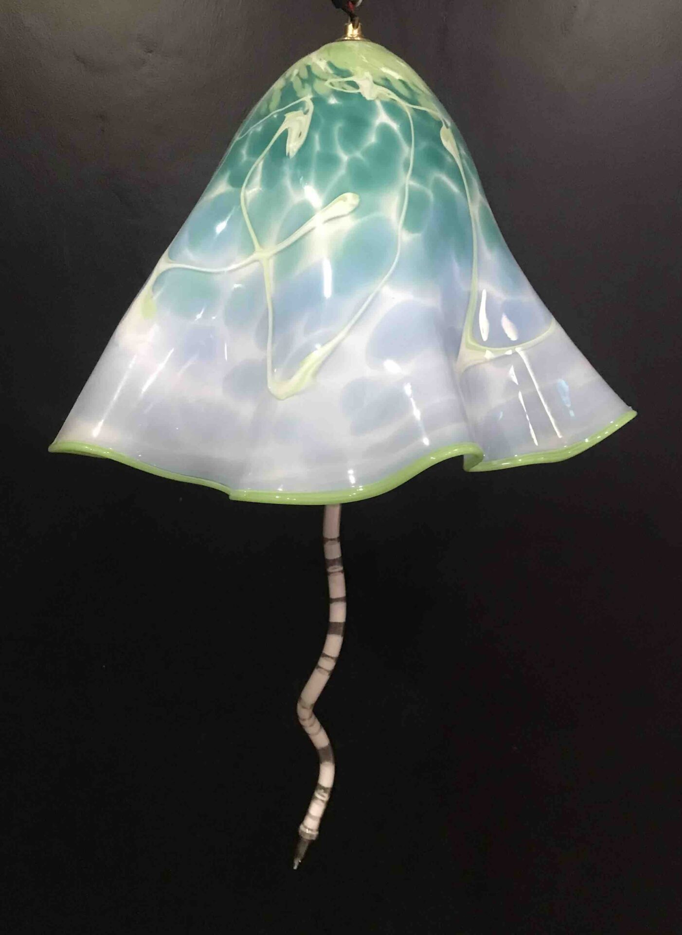 The Hana (Japanese for “flower”) feature a single multi-colored neon tube emerging from a hand-blown glass body illuminated from within by LEDs. Reminiscent of the Venusian Jellyfish, these flower-like pieces further the theme of the Venusian World Sculpture Collection. A large grouping of Hana are on display suspended along three stories in the stairwell at Venusian Gardens.
